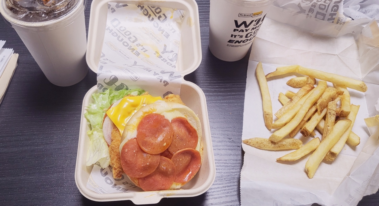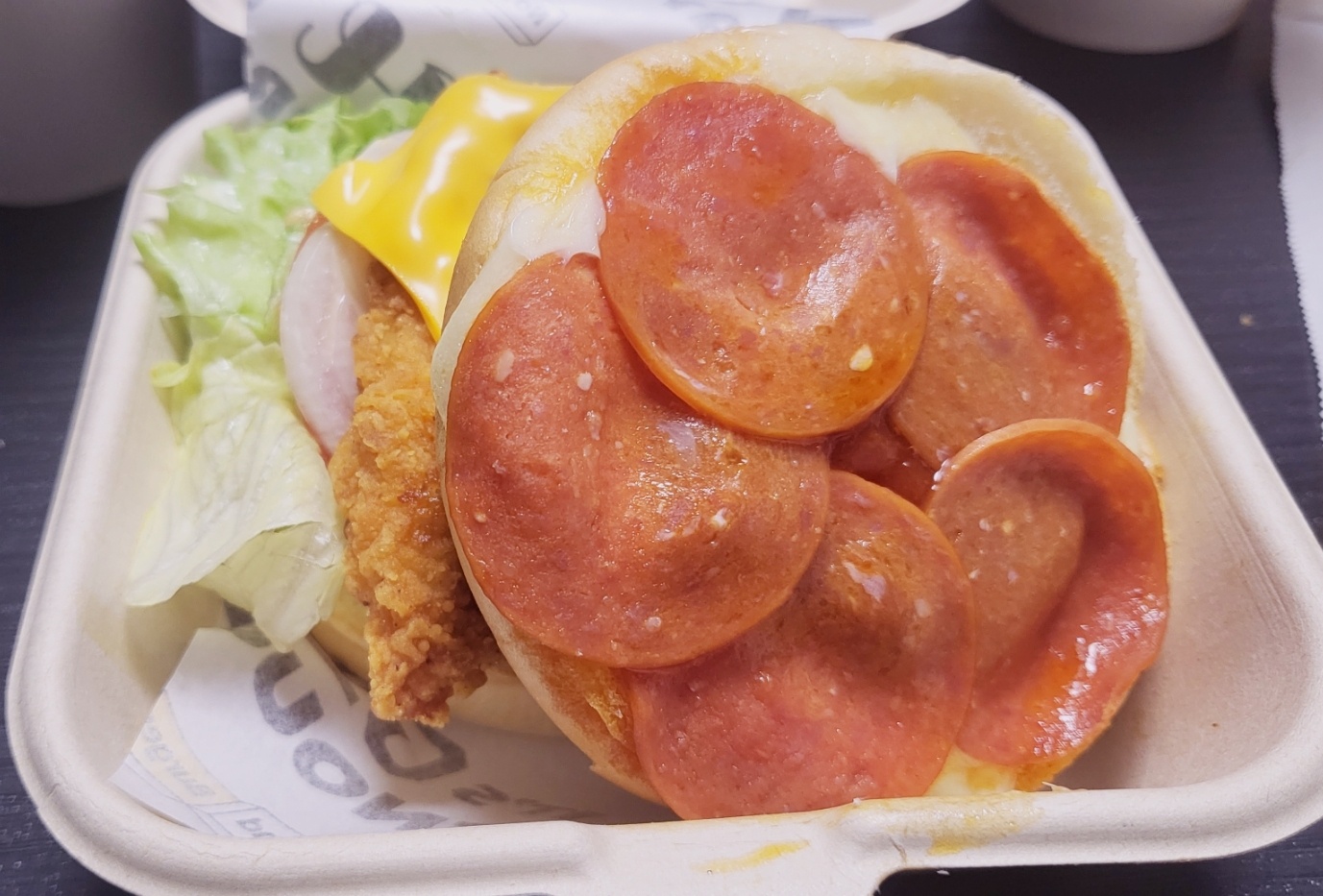 치킨버거 맨 위에 올라가는 번을 뒤집어서 치즈와 페퍼로니를 쌓은 버거다.