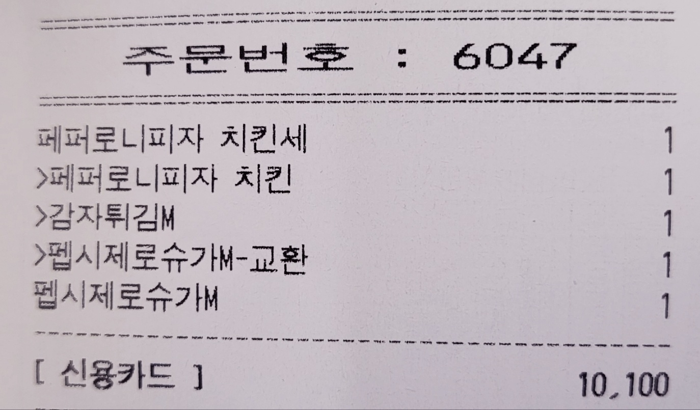 페퍼로니피자 치킨버거 세트 1개 + 제로콜라 1개 추가해서 10,100원 나왔다.