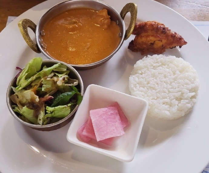 고기 한 조각, 카레, 밥, 난, 후식으로 나뉜다.